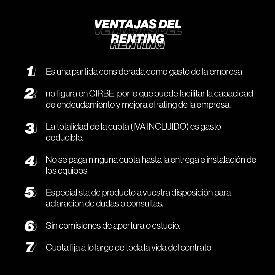 En Fitness Tech queremos ser tu aliado, nuestro objetivo es asistirte en la mejora de tus entrenamientos y en la obtención del gimnasio que tienes en mente, sin que tu presupuesto sea un obstáculo. Por ello, te brindamos nuestro servicio de renting para que puedas adquirir el material deportivo que necesitas sin dificultades. Este servicio es válido desde 24 meses hasta 60 meses, a partir de 6.000€ en adelante.