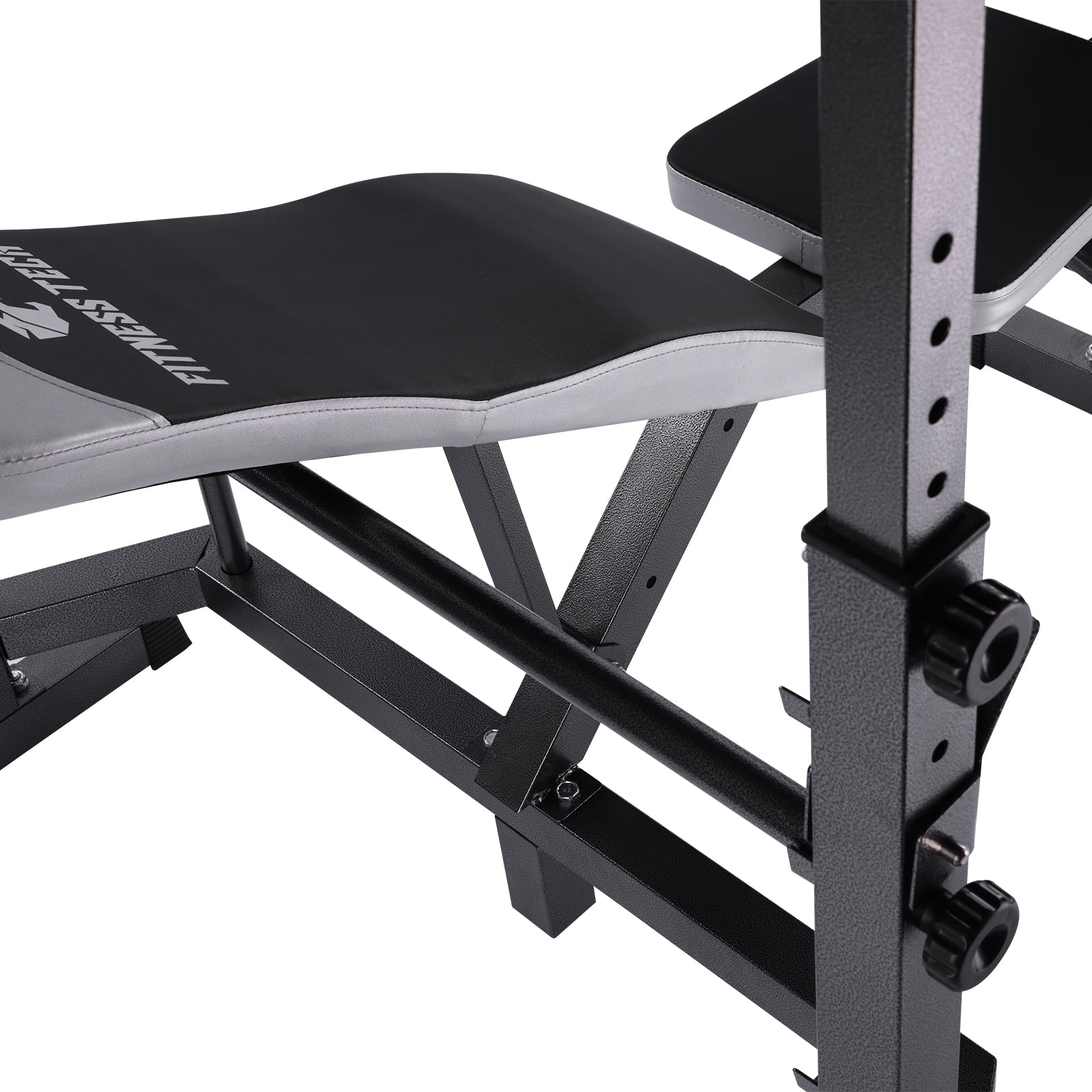 Banco de musculación Fitness Tech multifunción imprescindible para el entrenamiento de la fuerza y el desarrollo muscular. Si quieres ganar masa muscular y fortalecer todo el cuerpo, este es tu banco. Viene equipado con soportes para barras largas, pupitre para curl de bíceps y un ejercitador de piernas para un trabajo completo.