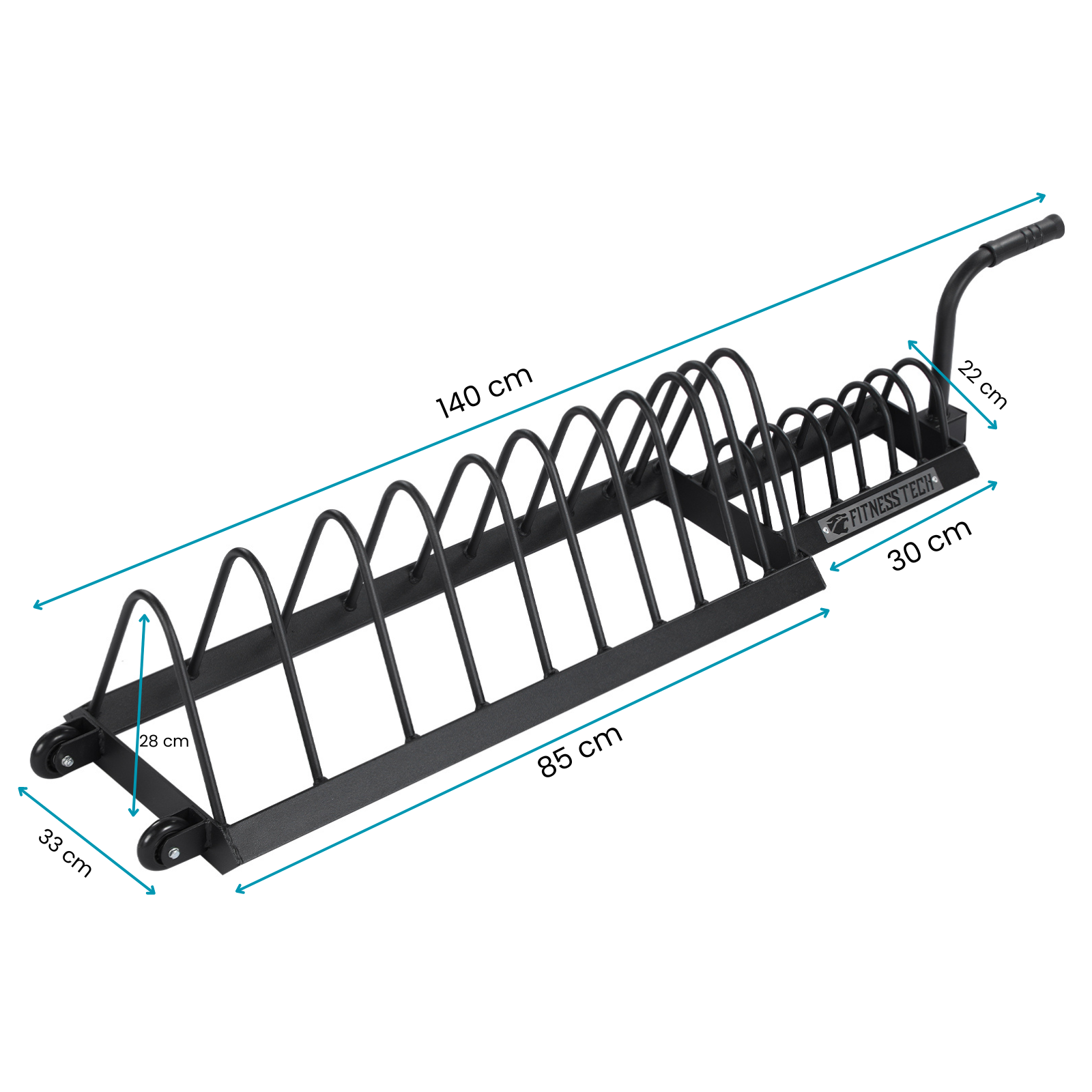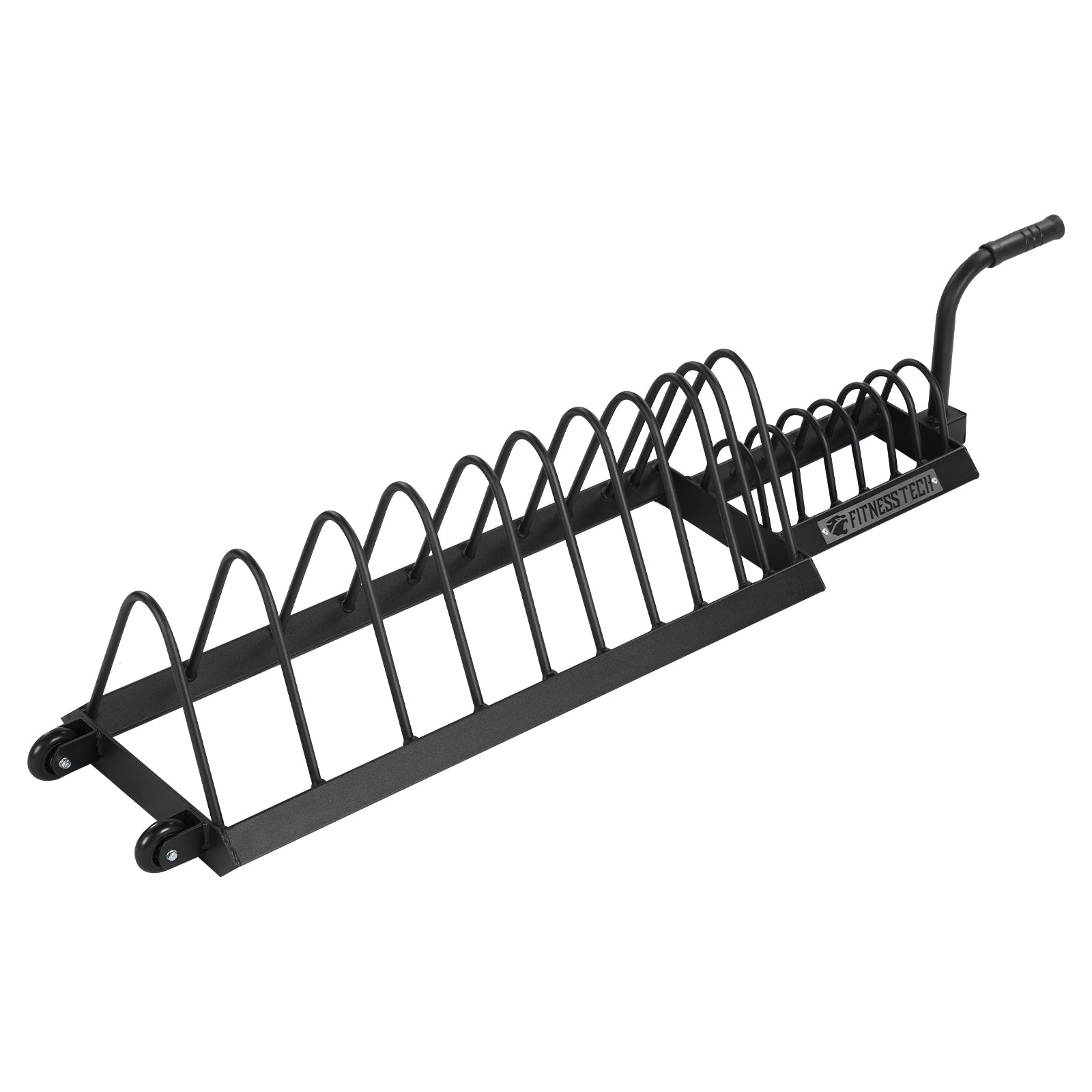Soporte para discos olímpicos con ruedas y asa transportadora.