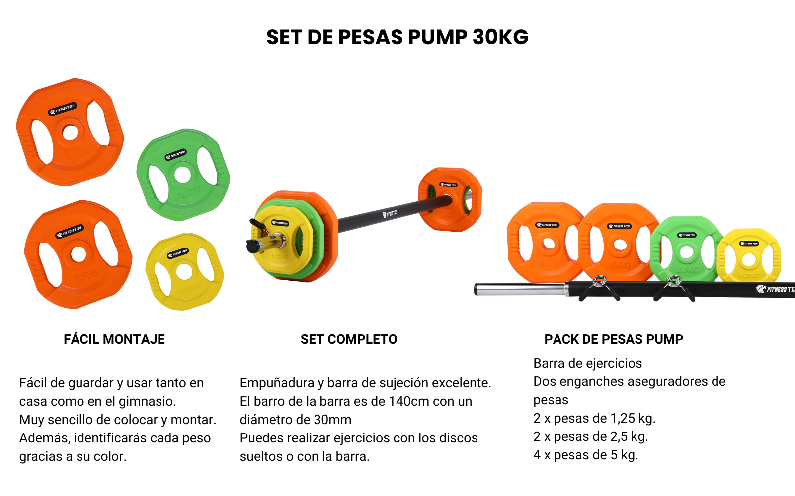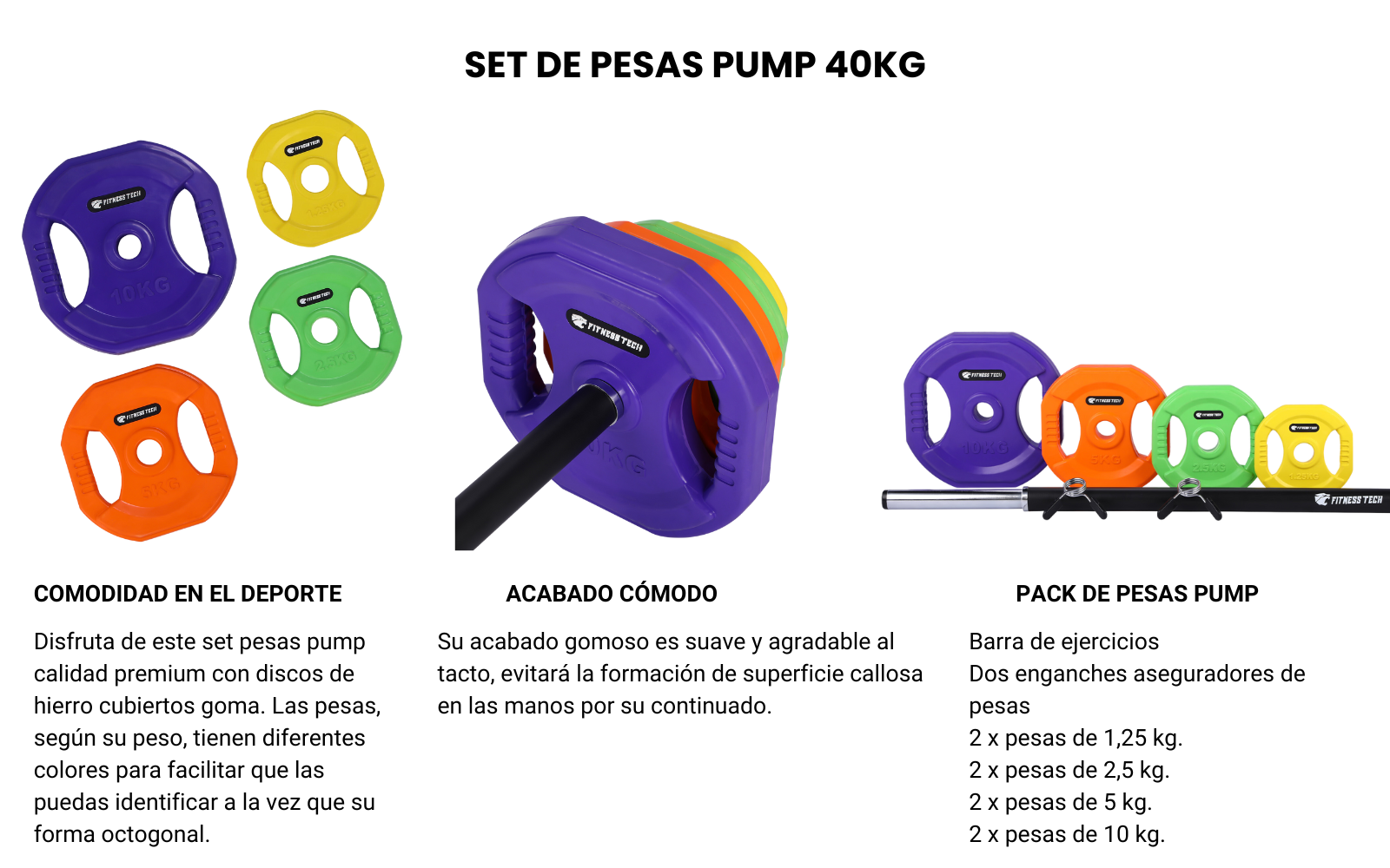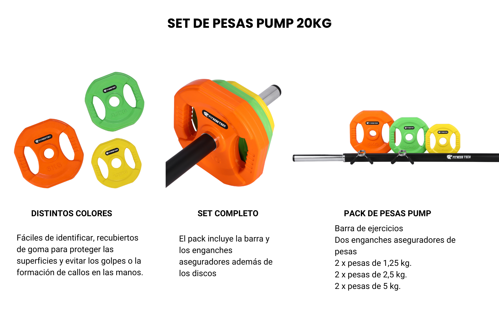 Este set Pump destaca por su equilibrio entre funcionalidad y durabilidad. La barra incorpora empuñaduras fabricadas en poliuretano de alta densidad, ofreciendo un agarre firme y agradable incluso en sesiones prolongadas. El sistema de cierres garantiza que los discos permanezcan estables durante el movimiento, permitiendo ejecutar ejercicios como press de banca, peso muerto, remo o movimientos funcionales con total confianza. Es una solución ideal para quienes buscan un equipo fiable, fácil de montar y preparado para un uso intensivo diario.