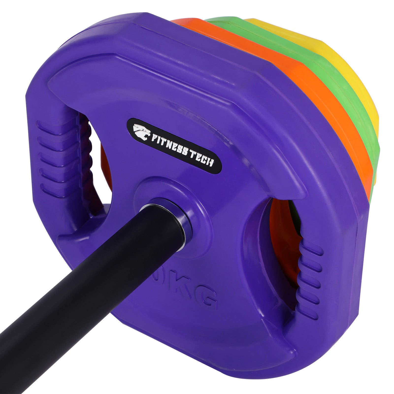 Los discos de hierro recubiertos de PVC engomado proporcionan una sensación de uso cómoda y segura, reduciendo el impacto y protegiendo el suelo durante el entrenamiento. Además, su diseño octogonal evita que las pesas rueden, facilitando la colocación y mejorando la seguridad en el área de trabajo. La identificación por colores según el peso agiliza los cambios de carga y aporta una experiencia de uso más fluida, especialmente en entrenamientos dinámicos o clases dirigidas.
