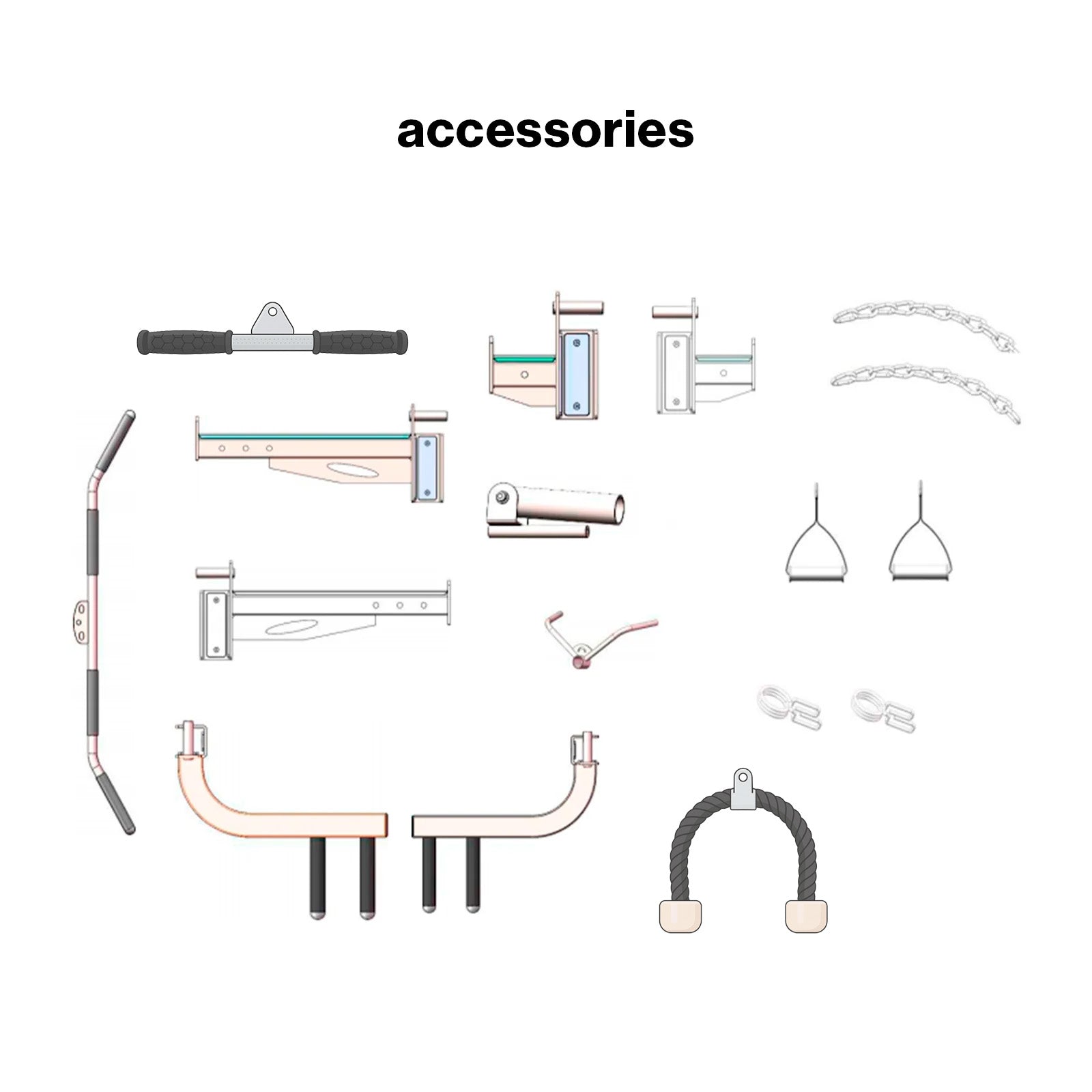 - Set completo de agarres: incluye barra recta, cuerda de tríceps, asas individuales y cadenas para ampliar las combinaciones de ejercicios en polea alta y baja.